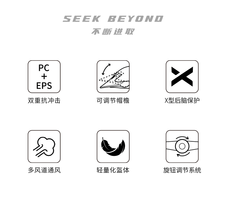 特點:PC+EPS雙重防護(hù),輕量化盔體,多風(fēng)道透氣,可調(diào)節(jié)帽檐,X型后腦勺加強(qiáng)防護(hù)設(shè)計。