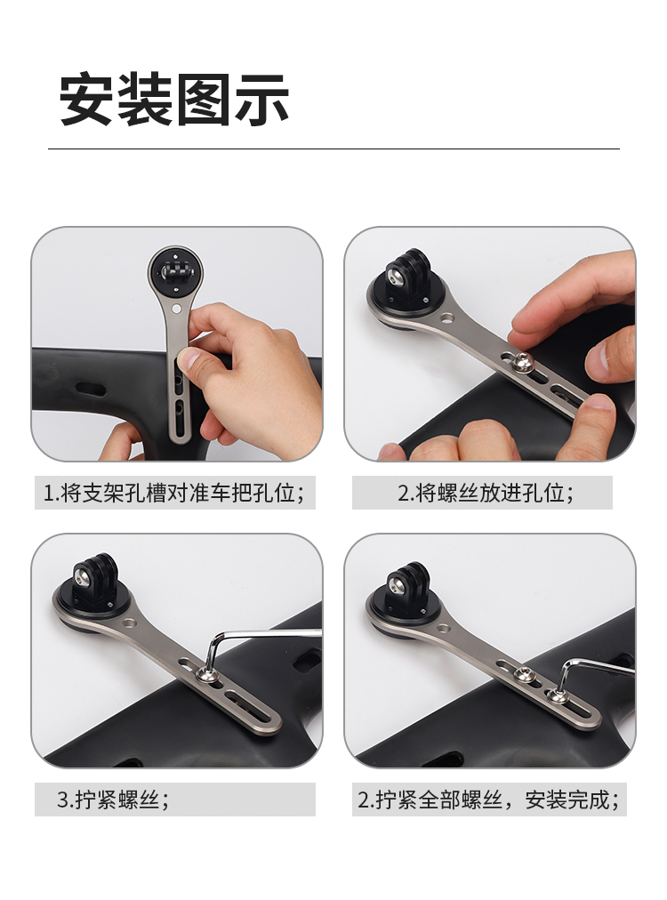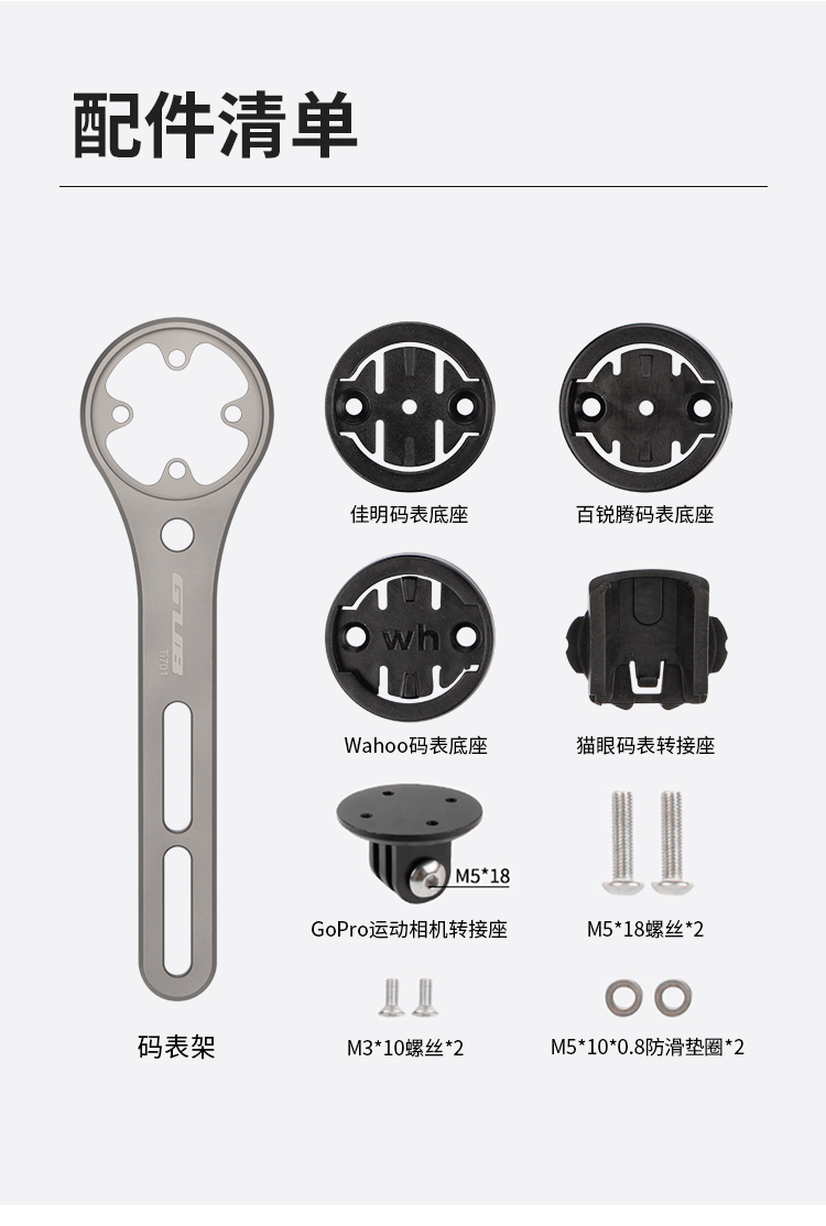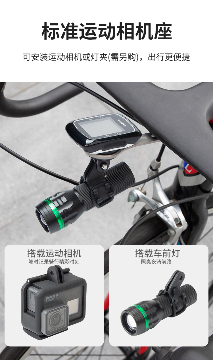 特點(diǎn):鈦合金架體,居中安裝節(jié)省空間(一體把專用),兼容多種碼表,標(biāo)配運(yùn)動相機(jī)接座,可擴(kuò)展使用運(yùn)動相機(jī)等配件